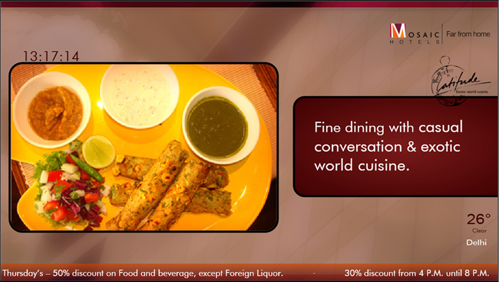 Revive the aura and comfort at your hotel, casino, cruise ship or amusement park and target business travellers, guests on vacation, or both. Digital signage in the hospitality sector can broaden your brand reach and impression. Impress your visitors with cutting edge signage solutions such as way-finding screens, self-check-in kiosks, TV programs and instant flight, traffic or weather updates.